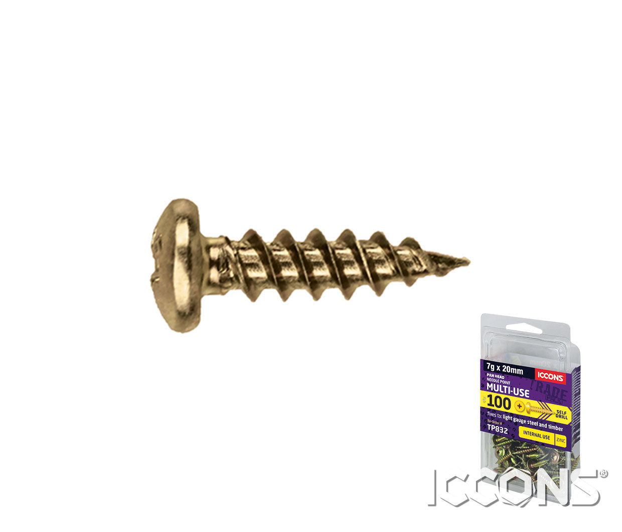 Needle Point Pan Head screw designed for fixing timber or thin steel sections to thin steel. Needle point tip aids in piercing the surface material, eliminating the need for pre-drilling (please see screw self drilling capacities). The Pan head provides a neat, aesthetic finish making them perfect for fixing signs, brackets or lining boards which require a neat and discrete finish. Available in Zinc Yellow these screws are best used in low corrosion dry environment.
