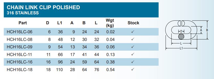 WA Fasteners supply 316 Stainless Steel Chain Link Clips in the following sizes