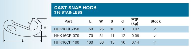 | 316 CAST SNAP HOOK: 100 HHK16CP-100See other available pack quantities | 1 | $16.98 |