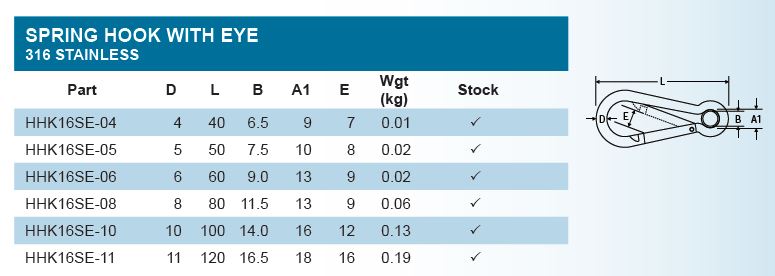 | 316 SPRING HOOK W/EYE:10 X 100 HHK16SE-10See other available pack quantities | 1 | $16.52 | |